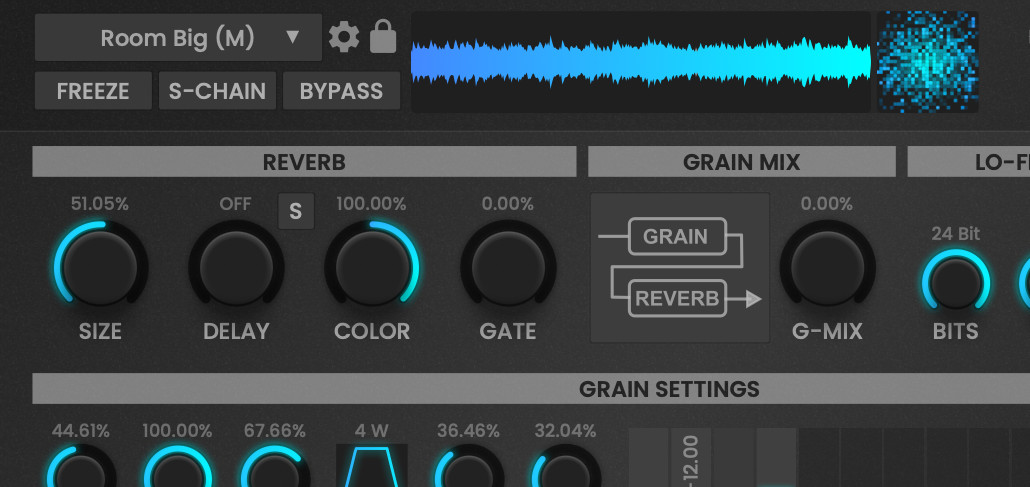 The grain engine can be used to pitch the sound with different pitch offsets or add more chaos and variation to the final reverb output. Different routings are possible.